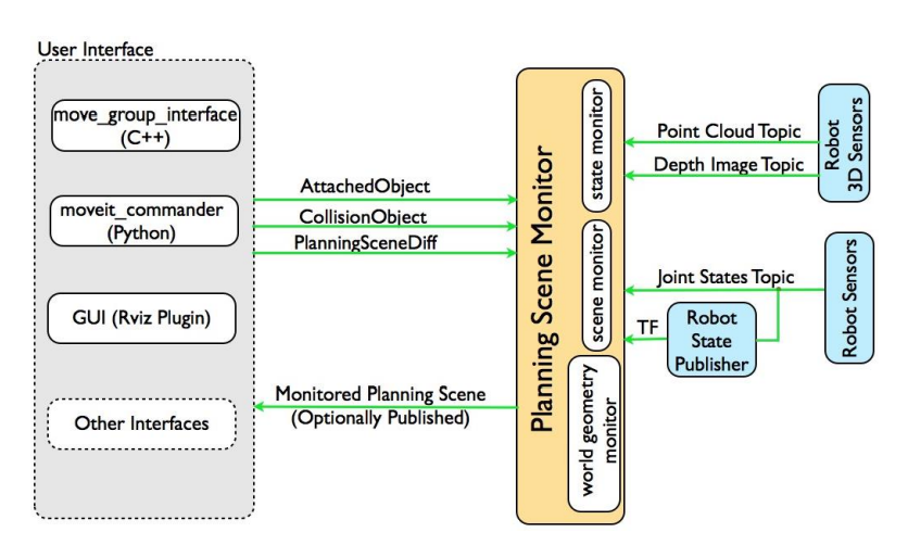 플래닝 씬 모니터는 joint_states 토픽을 읽고 센서 정보와 월드 기하를 읽는다. 그리고 플래닝된 모션 수행 중 장애물과의 충돌 가능성을 고려한다.