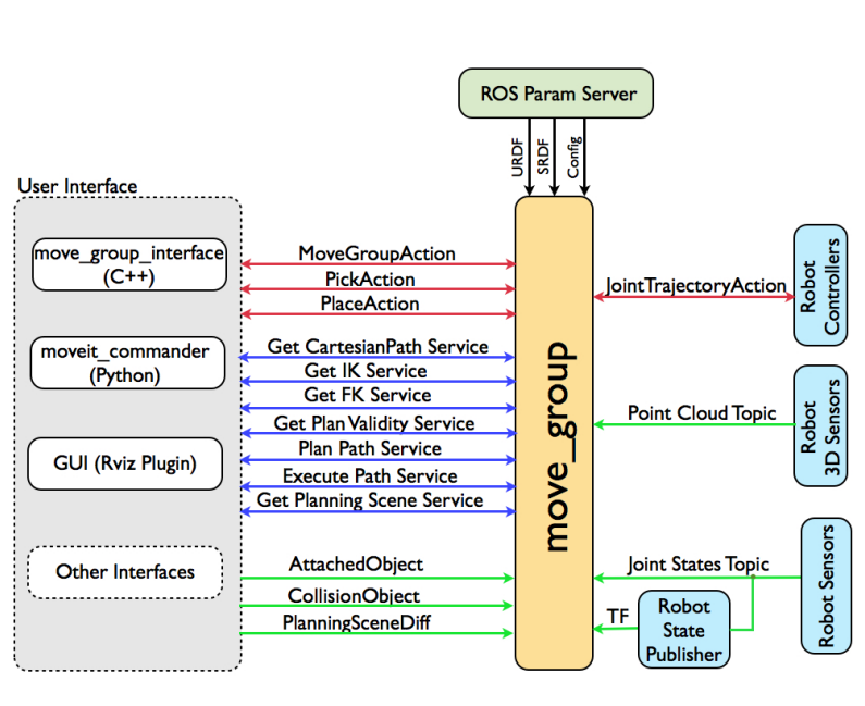 move_group 노드가 포인트 클라우드, 조인트 상태, TF와 같은 로봇 정보를 토픽 및 서비스 형태로 수집한다.